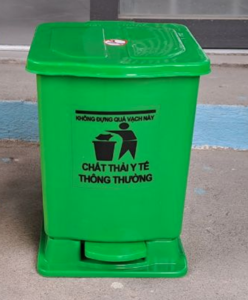 - Thùng 5L đạp chân màu xanh dùng để chứa rác thải thông thường. Đây là những loại rác thải sinh hoạt và phát sinh trong quá trình khám bệnh như thức ăn thừa, sản phẩm thải lỏng không gây nguy hại,…